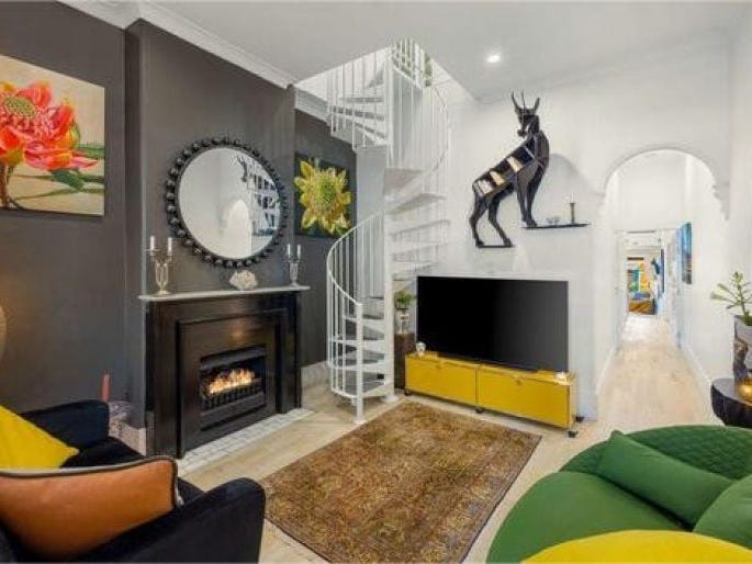 - Spiral staircase to upstairs attic bedroom, study nook, bathroom and ceiling drying rack.