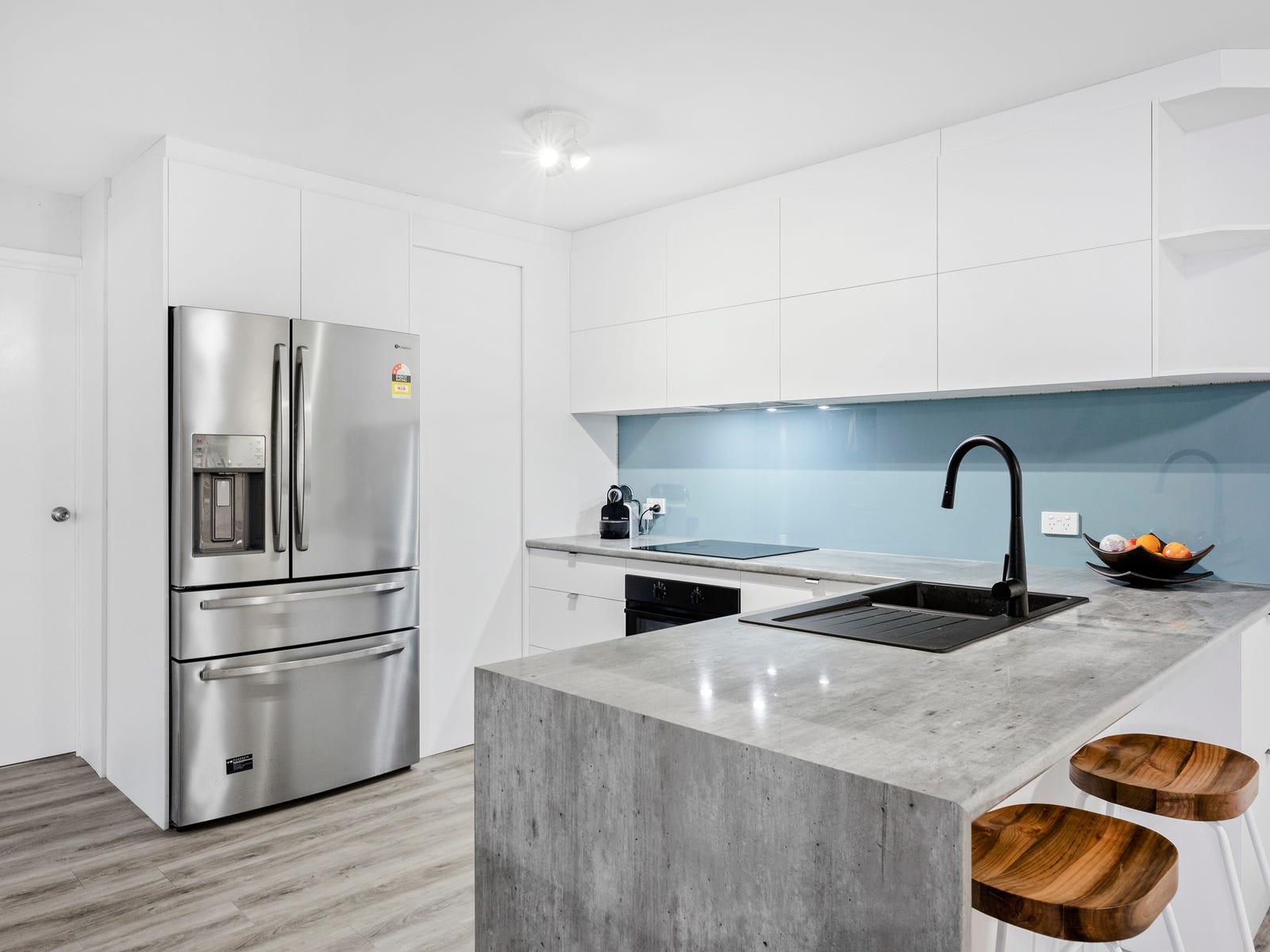 a fully equipped and recently renovated kitchen with dishwasher, oven, cooktop, microwave and large French door fridge with two freezer drawers and plumbed in ice maker to the outside.