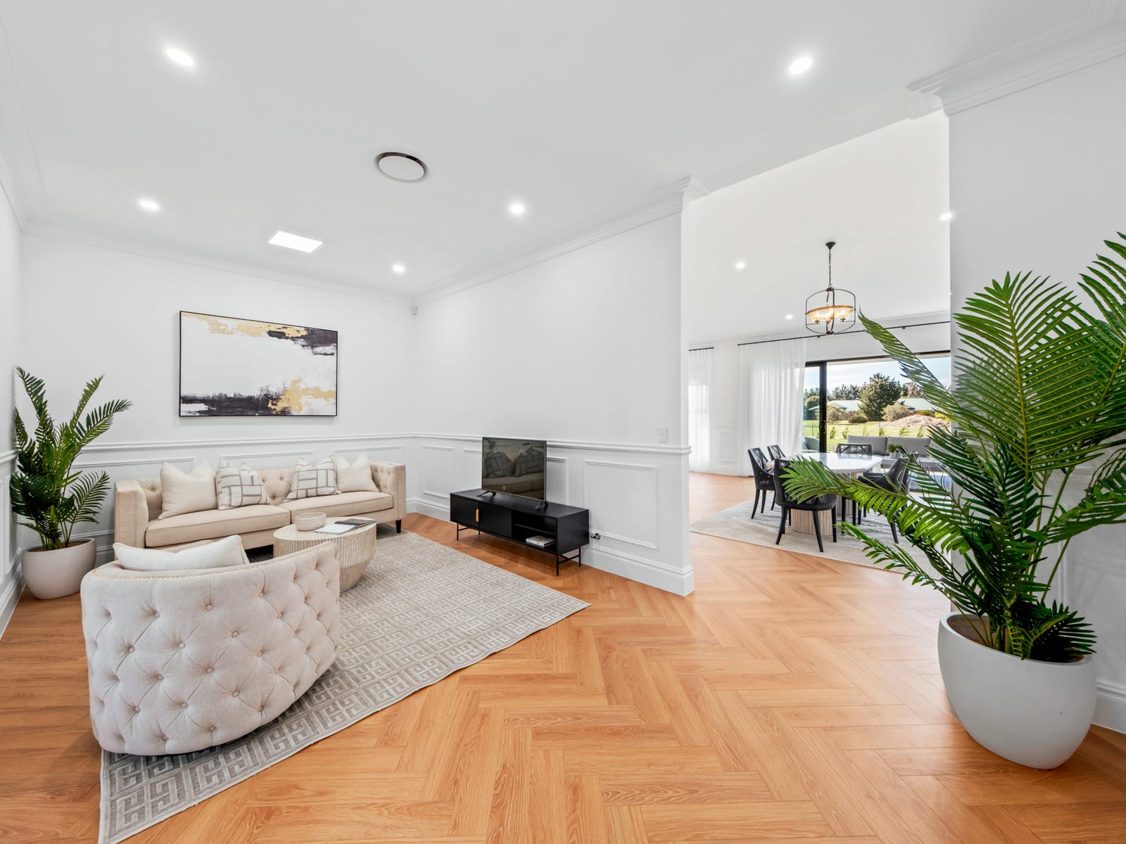 Step inside to soaring raked ceilings, light-filled interiors and a flowing floor plan perfect for family living and entertaining. At the heart of the home, the gourmet kitchen with stone island bench and walk-in butler s pantry flows to open-plan living and dining, complete with feature fireplace. A separate family/media room and mudroom add practicality to the elegance.
