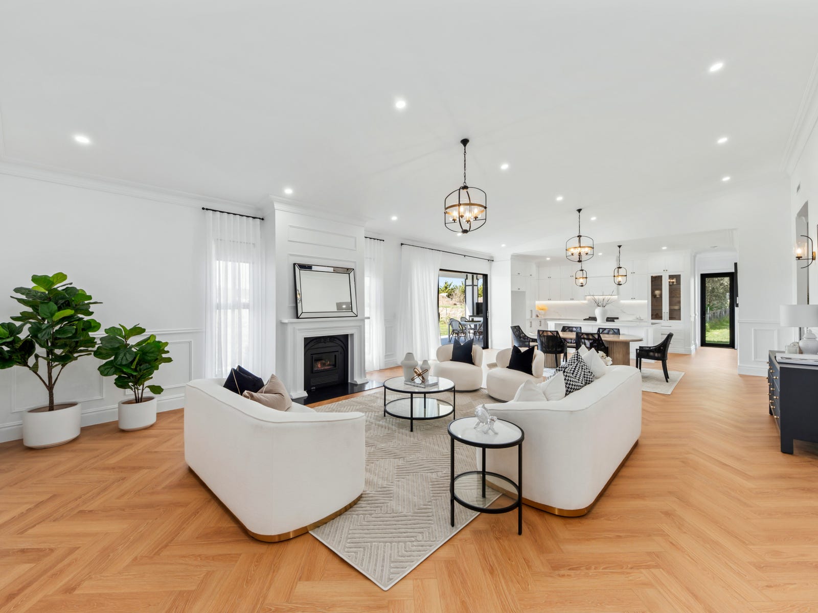 - Light-filled open-plan living with feature fireplace, plus separate family/media room