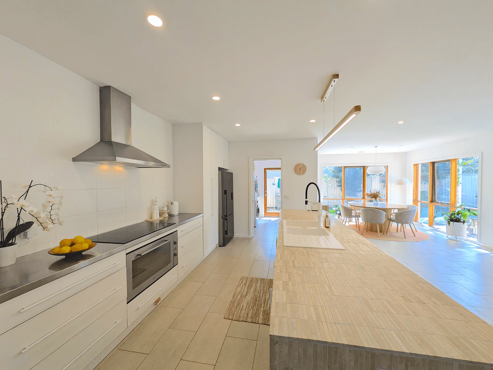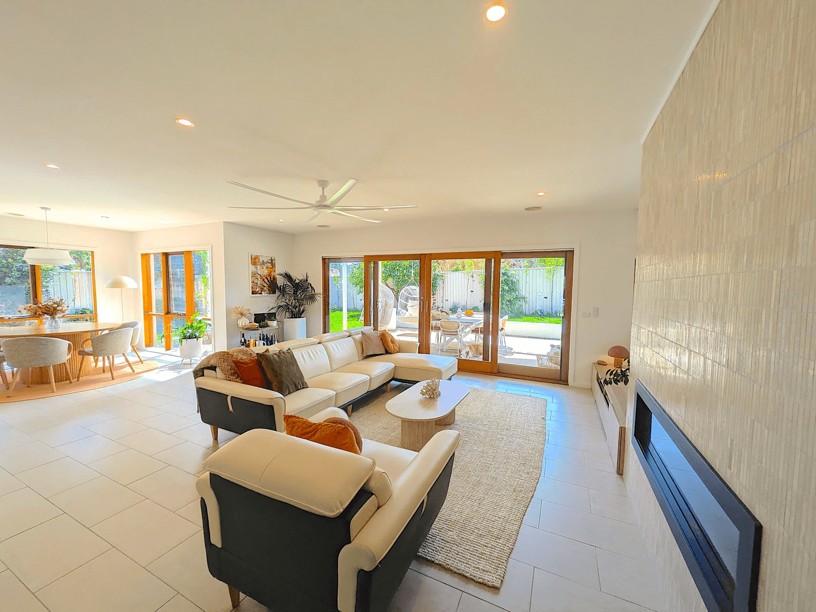 At the heart of the home, the open-plan living, dining and kitchen zone creates an expansive entertainers paradise. A custom feature stone fireplace creates a warm centrepiece, while the gourmet kitchen impresses with Miele appliances, induction cooktop, a full butler s pantry and sleek engineered flooring underfoot.