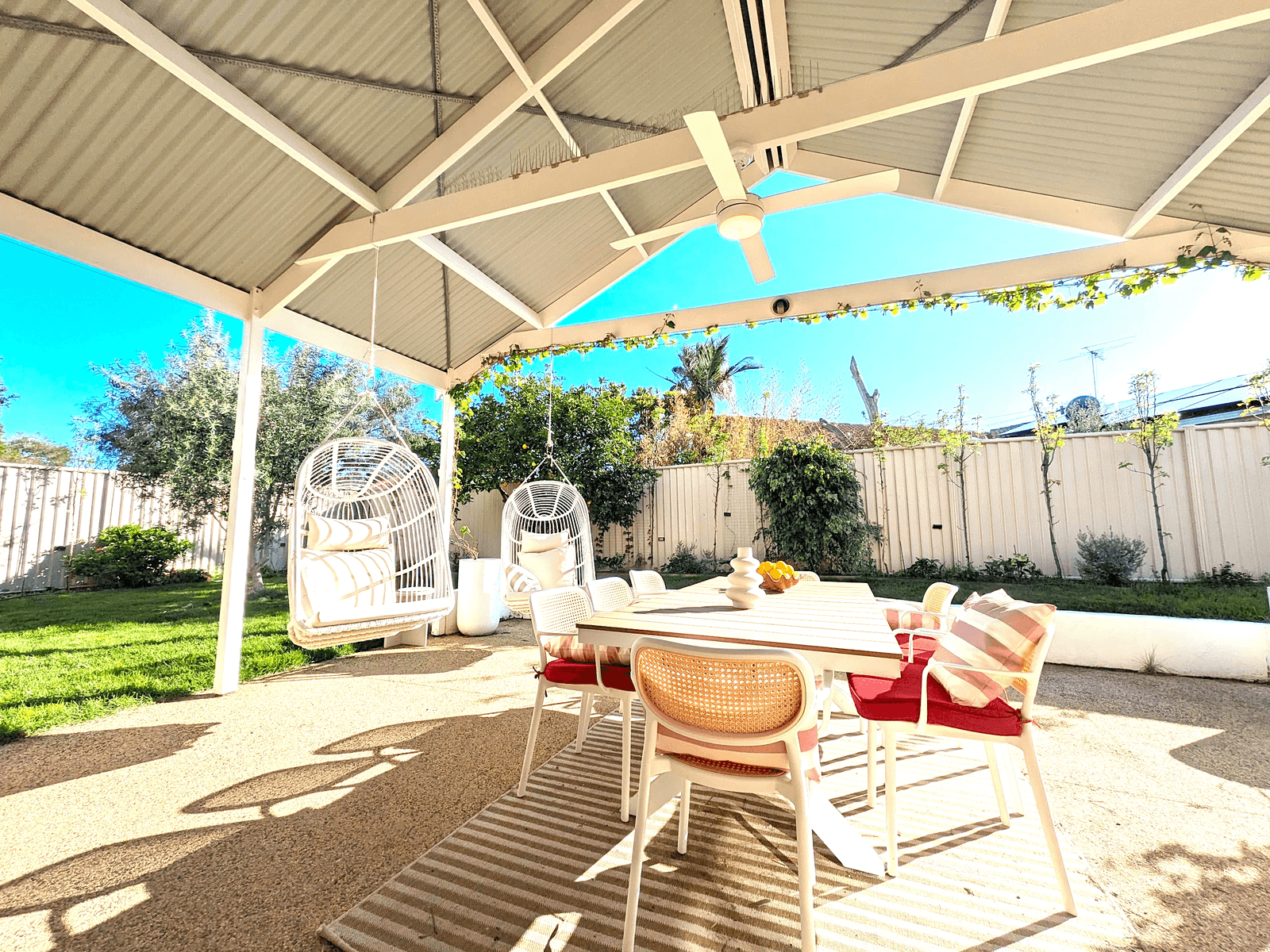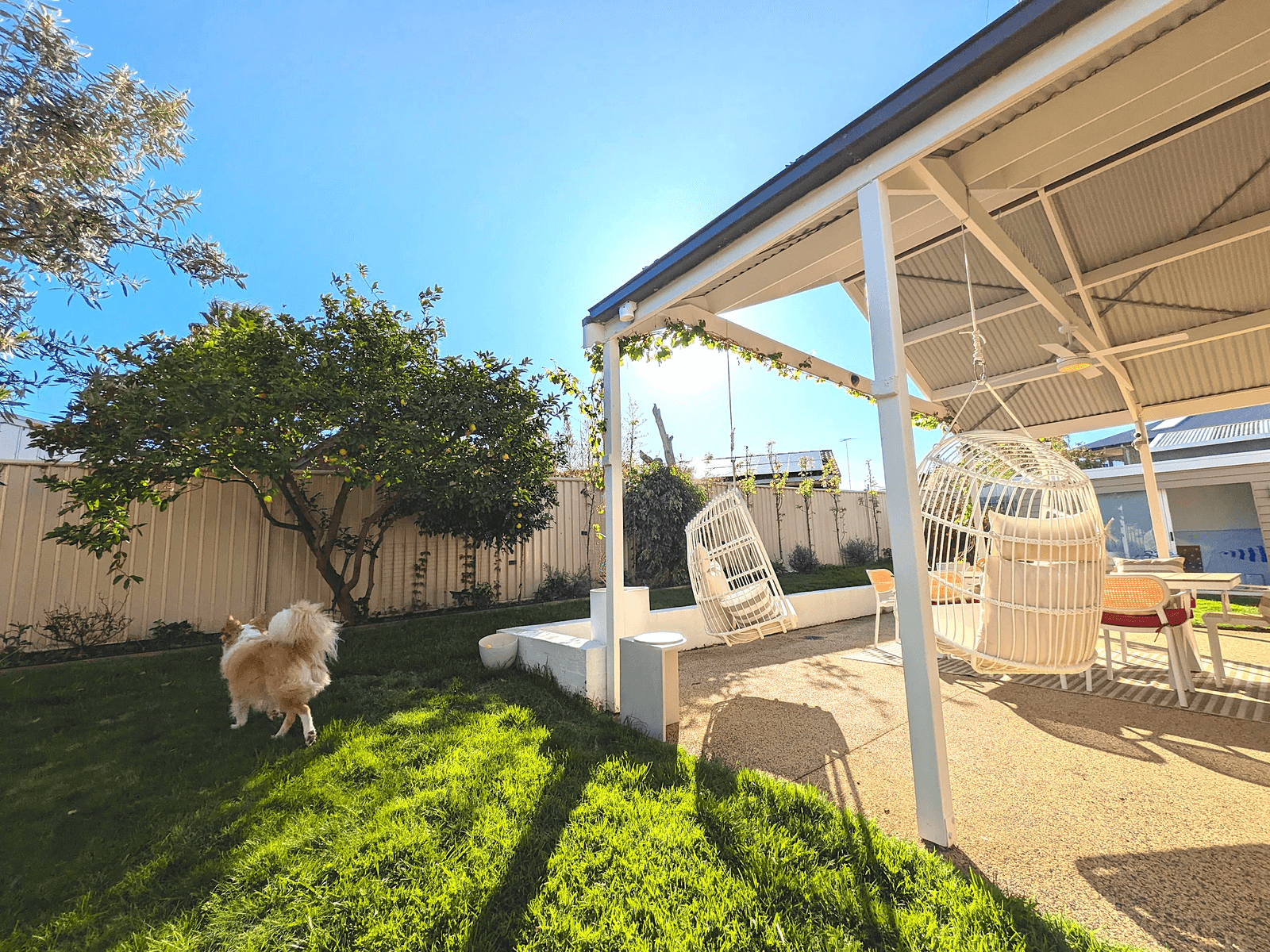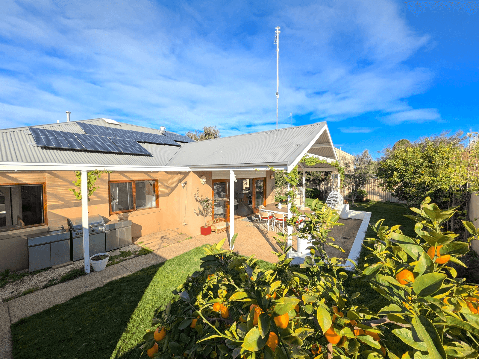 Outdoors, an expansive entertaining area overlooks secure gardens ringed with leafy pear trees, established fruit trees and a thriving veggie patch.