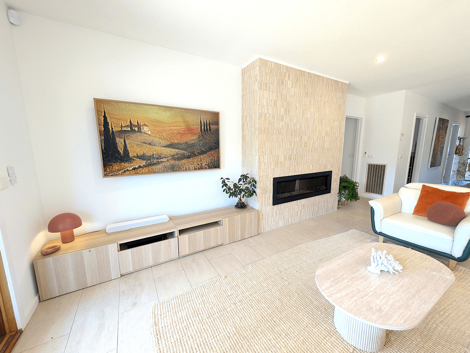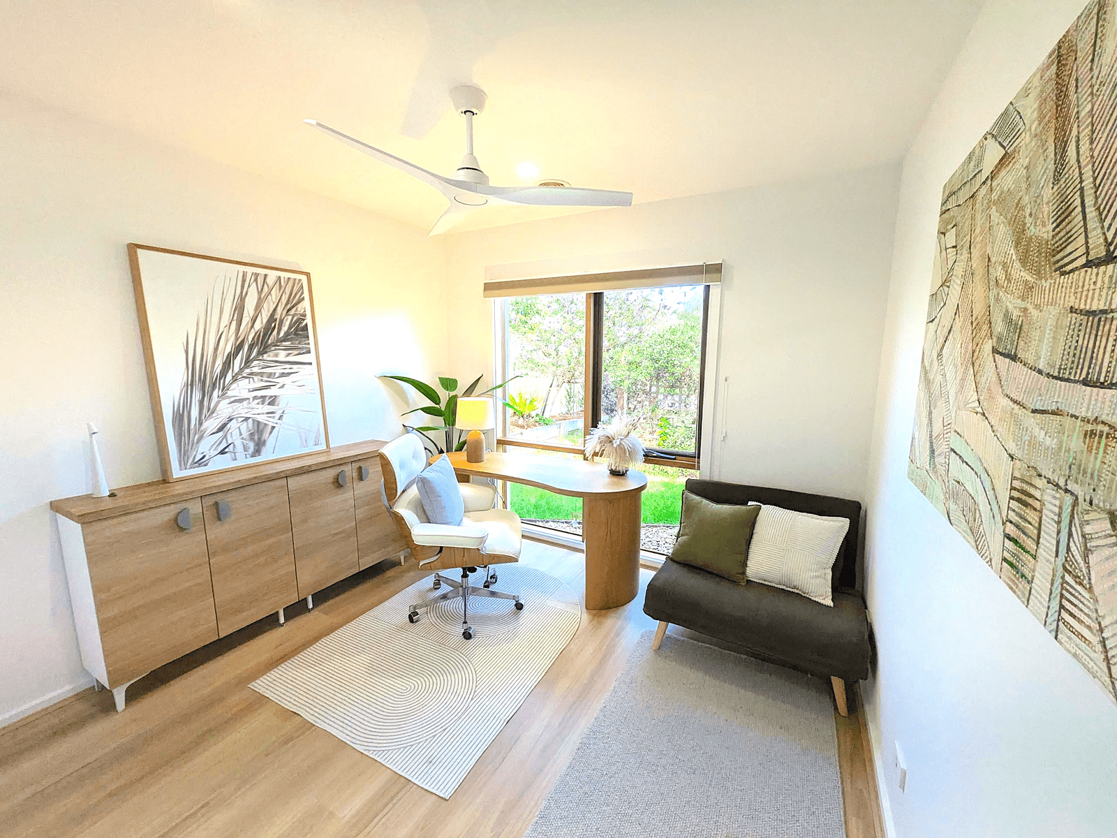 Step inside from the native landscaped garden to discover a formal central hall that leads to the spacious main bedroom with walk-in robe and full ensuite. Three further bedrooms, each with mirrored built-ins, are complemented by freshly updated bathrooms, featuring Italian travertine stone benchtops and quality European fittings. A separate stylish studio offers flexibility as a home office, gym, or private retreat.
