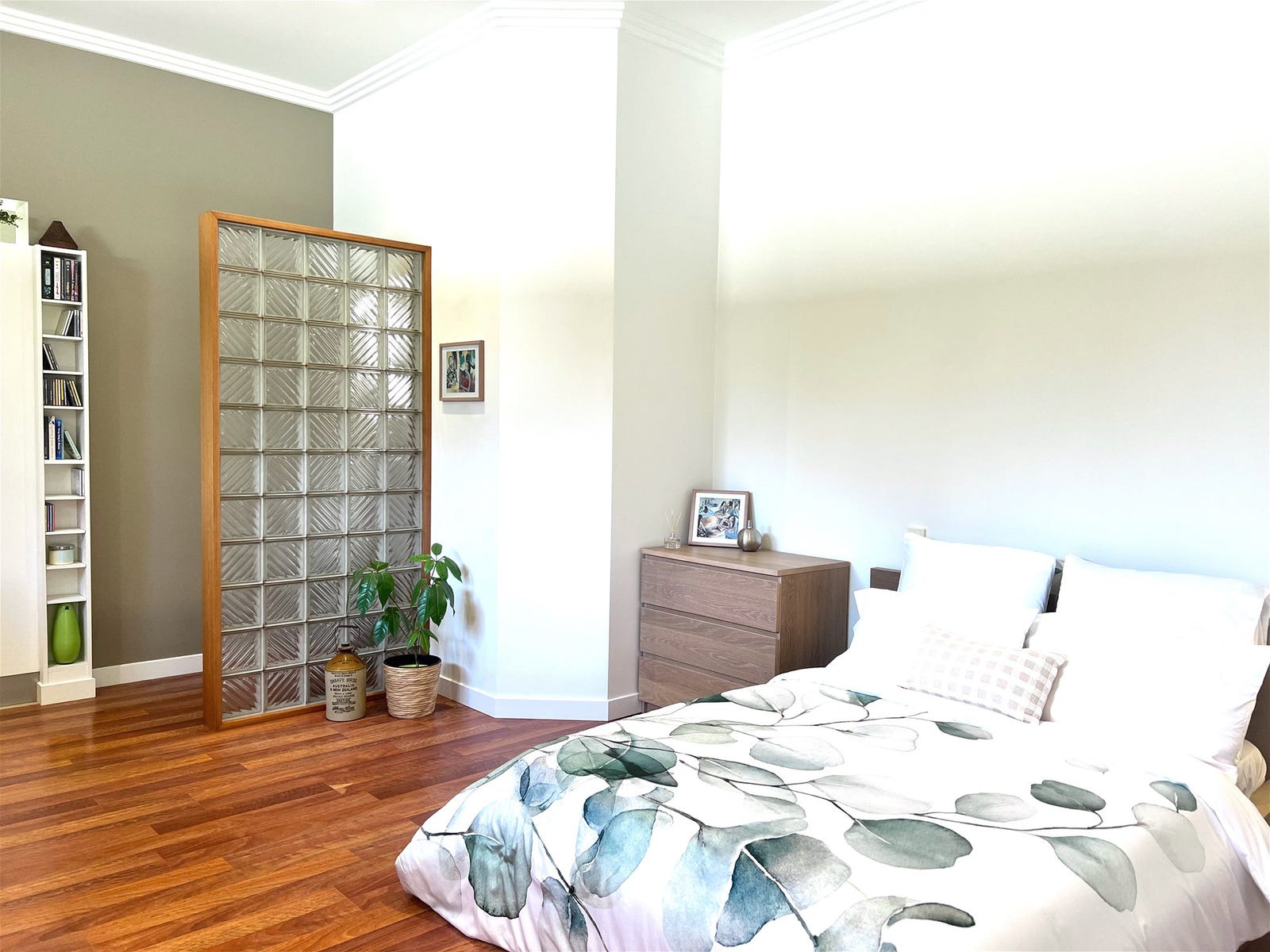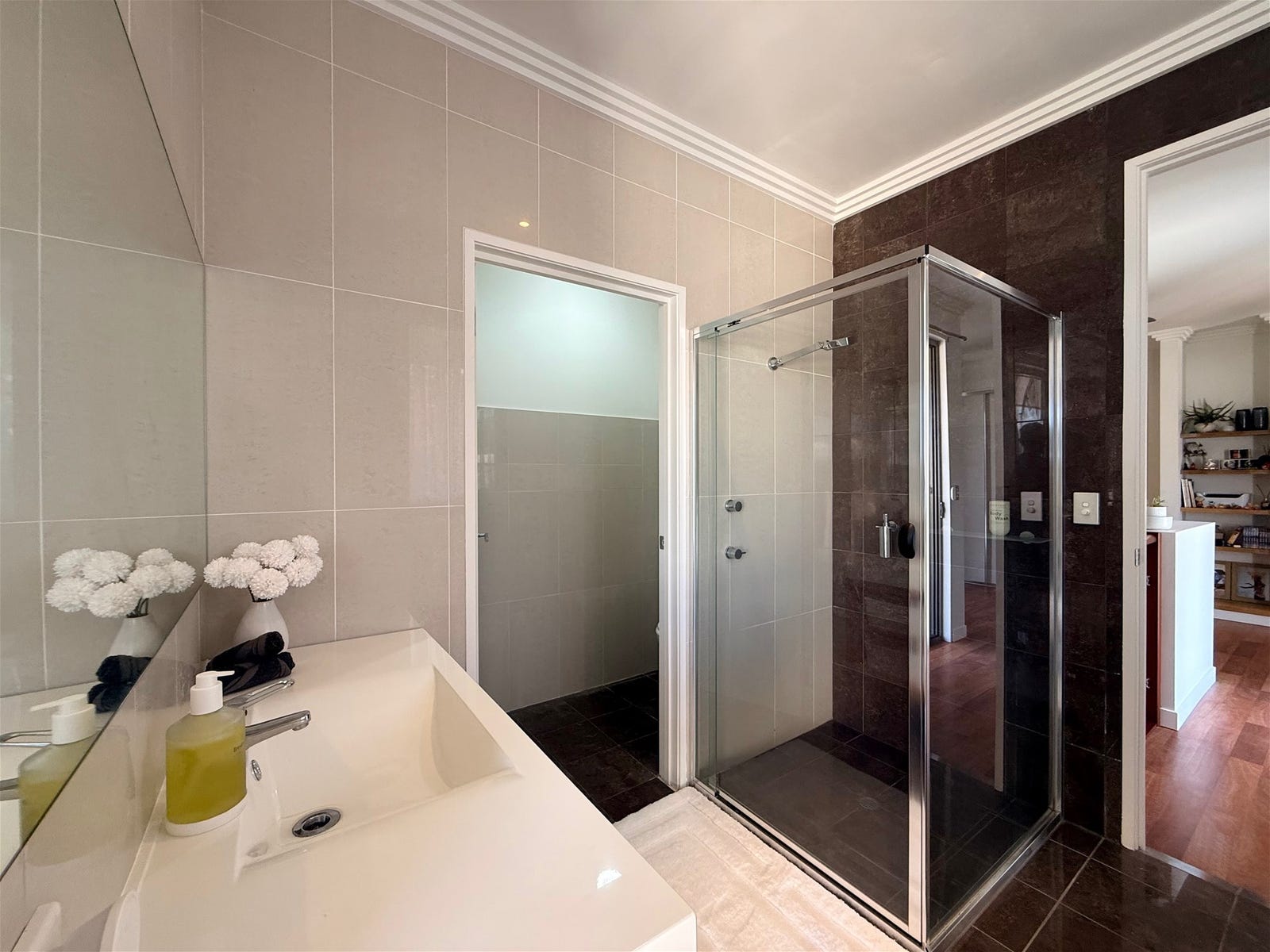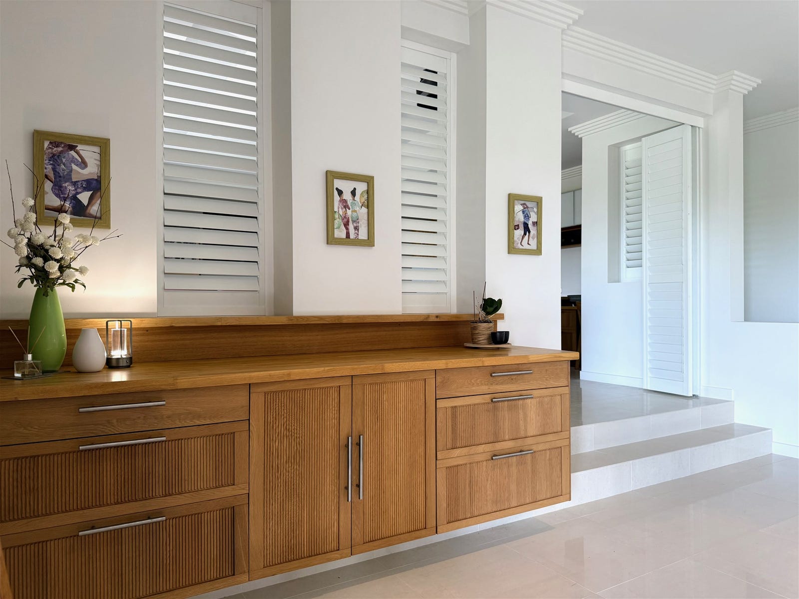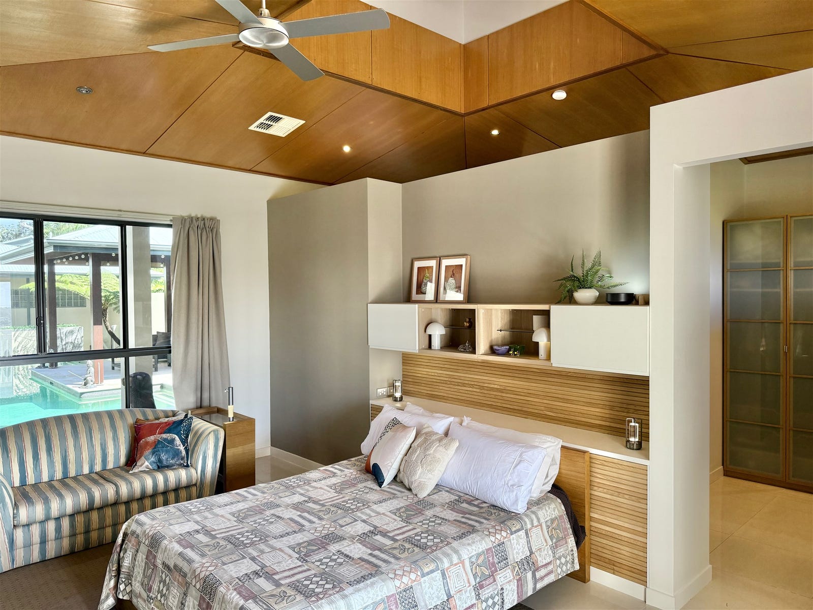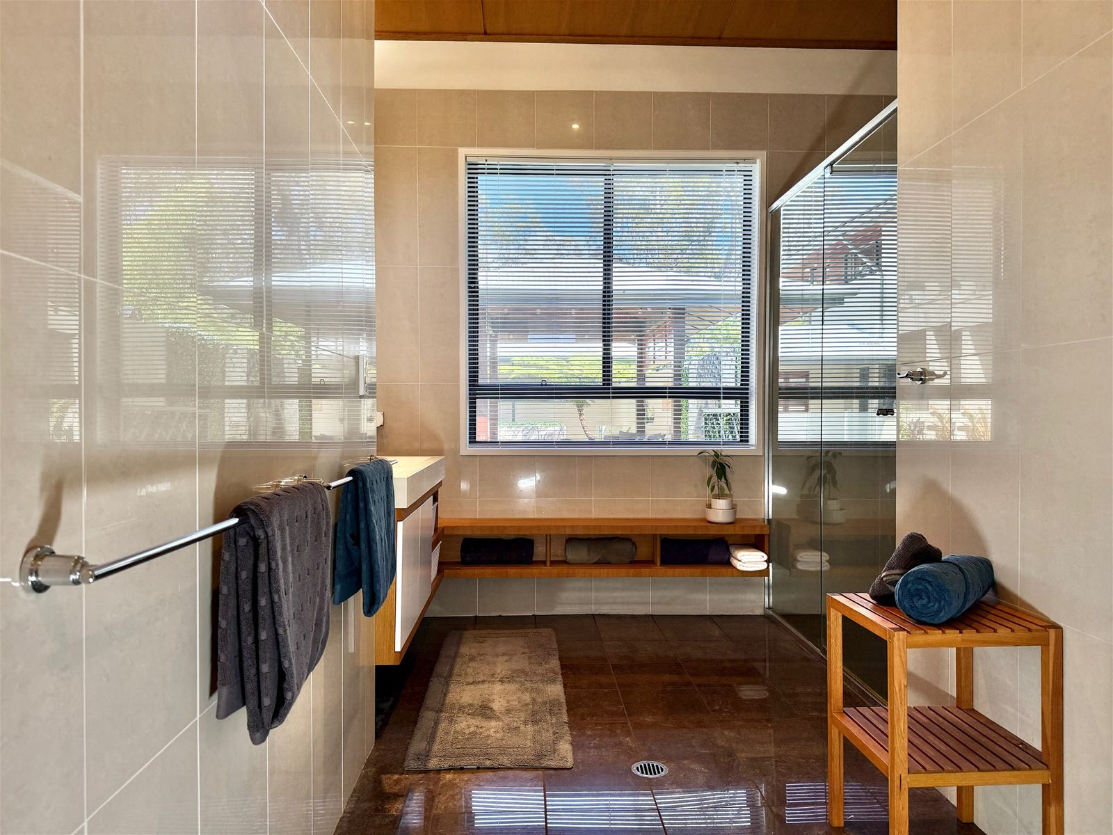 The Master bedroom, walk through wardrobe and en-suite (total 40 m2) is a separate pavilion connected by a glassed walkway and features vaulted oak veneer ceiling with central louvered section to provide cross flow ventilation, ideal for those hotter summer evenings. The bedroom and ensuite have pool views with sliding doors accessing both the pool and rear verandah.