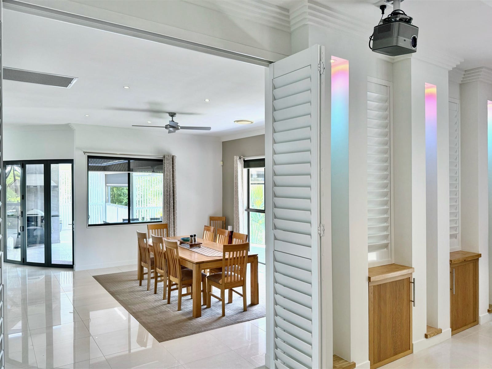 The Ground Level also features a generously proportioned family lounge room, kitchen with walk-in pantry, office nook, powder room, massive dining room and a 120 inch motorized screen in the media room featuring vaulted ceiling and plantation shutters for light and ventilation control. The expansive, wrap around, shuttered rear verandah area faces to the ocean overlooking the native forest corridor and features BBQ range-hood, LED track lighting and seven panel curved glass stacker doors, opening from the centrally located kitchen, making it the perfect al fresco group entertaining area.